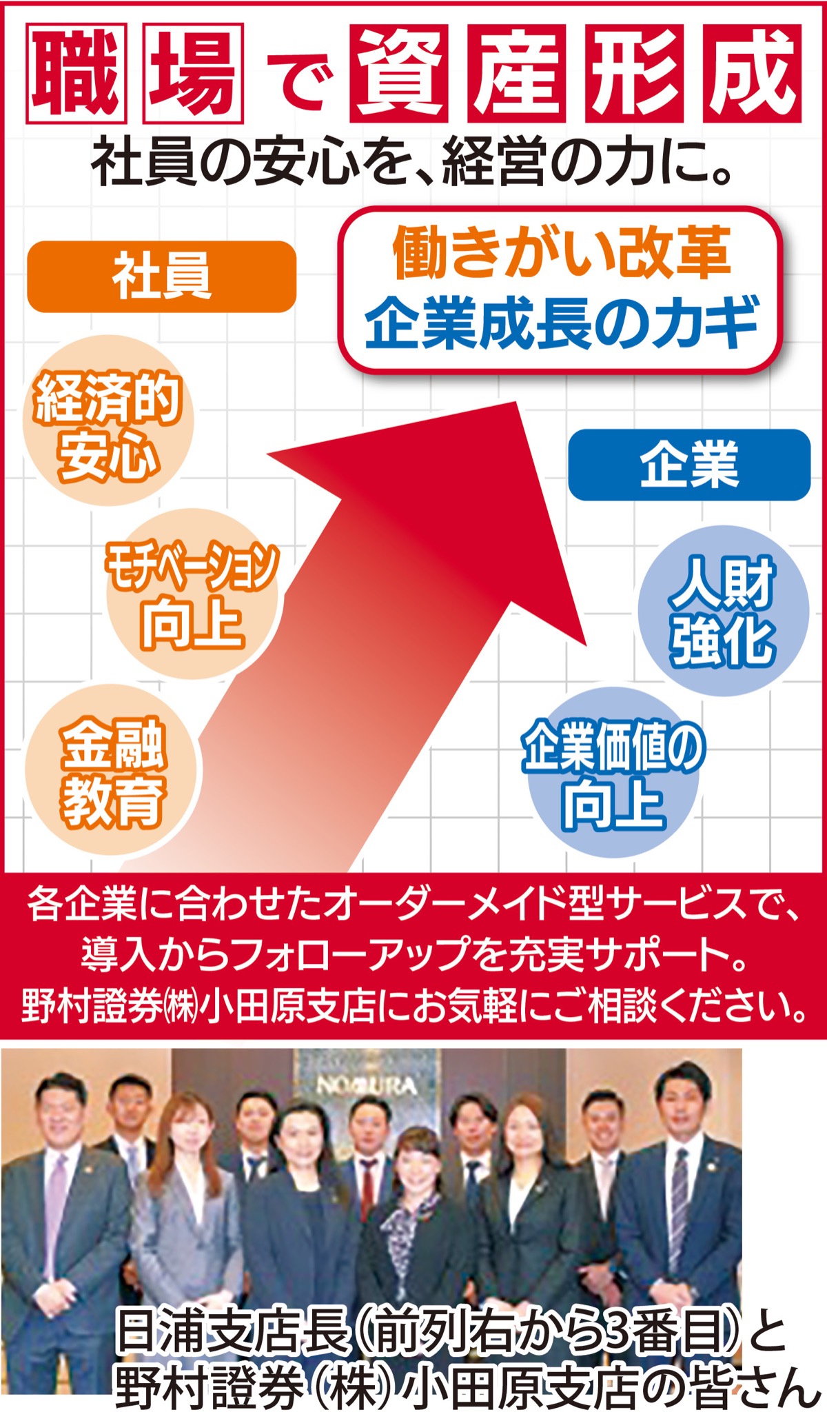 今年度から高校で金融教育が始まり、資産形成はますます重要性を増している。社会人向けの金融教育が急務の中、野村證券(株)小田原支店では県西の企業の従業員向けに金融教育も実施。日浦裕子支店長は「社員の皆さまの金融知識向上を通じて、ライフプランに貢献していきたい」と話す。