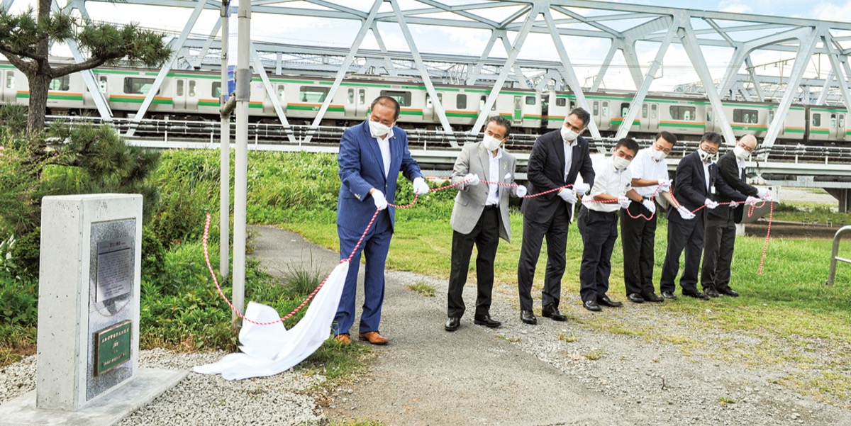 東海道線の前身である熱海線の橋梁として1920(大正9)年、酒匂川に架けられた「酒匂川橋梁」の記録を残す記念碑がこのほど建立された。8月31日には除幕式が行われ、守屋輝彦小田原市長や小田原箱根商工会議所の鈴木悌介会頭らが出席。今年は鉄道開業から150年という節目の年で、守屋市長は「当時の技術力の高さを感じる。後世に、そして地域に伝えていく貴重なタイミング」と話した。