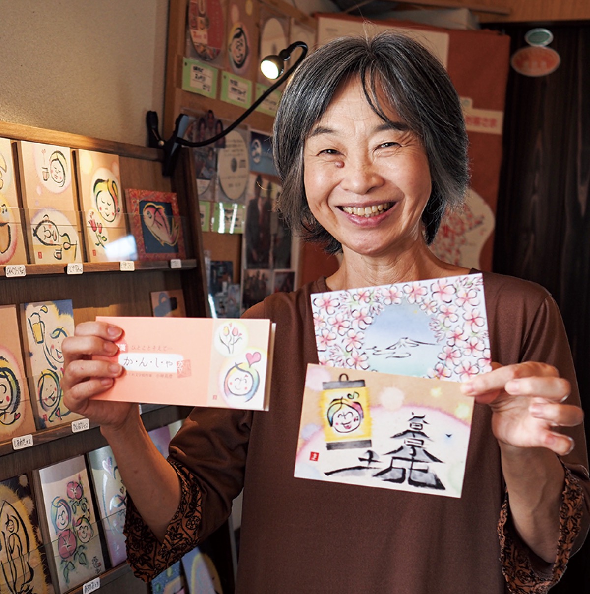文字だけで絵画のように描く「かくれ文字絵」を手掛ける現代アーティスト・小林真澄さん(66)が、自身の作品を常設展示するカフェ「コーヒー&アトリエ かくれんぼ」(小田原市柳新田80の4)の11周年を記念して、ポストカードと一筆箋を作成した。