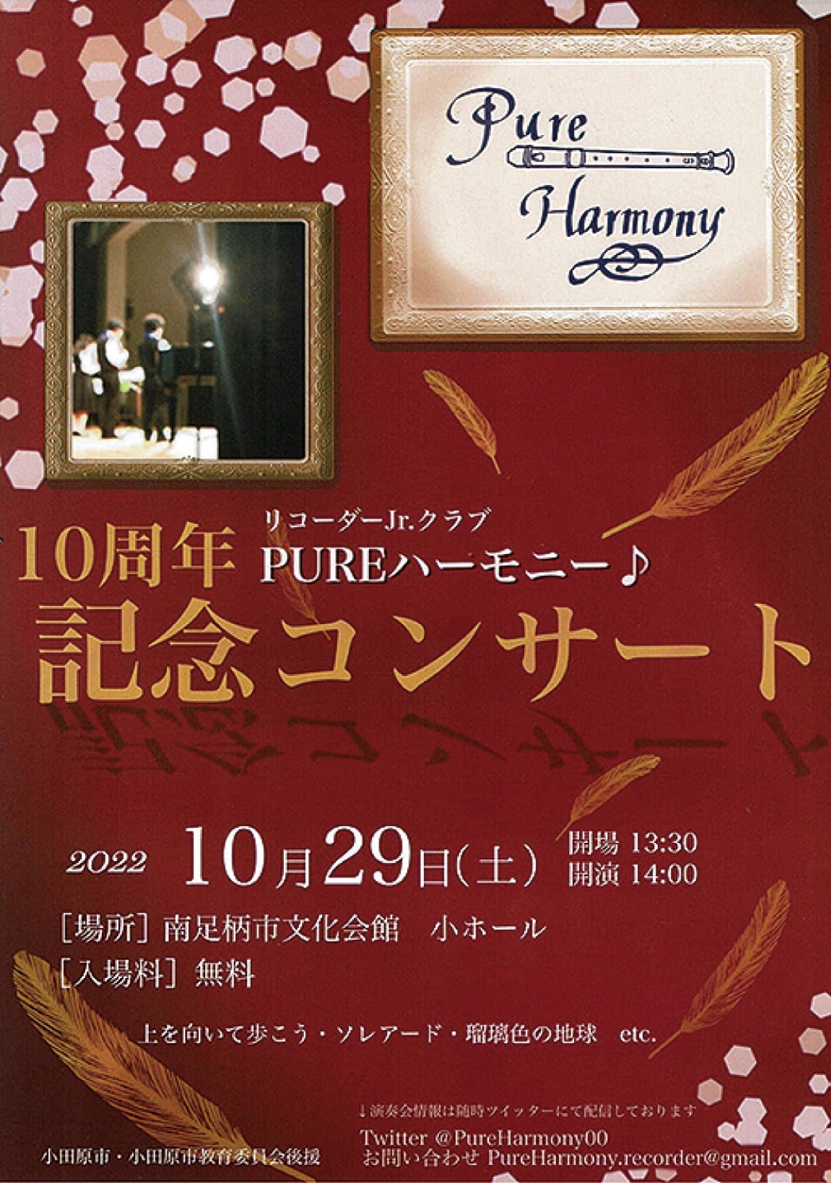 南足柄市文化会館小ホールで10月29日(土)、リコーダージュニアクラブ「PUREハーモニー♪」が10周年記念コンサートを開催する。午後2時から3時30分(1時30分開場)。入場無料。『上を向いて歩こう』や『ソレアード』、『瑠璃色の地球』などを演奏する。