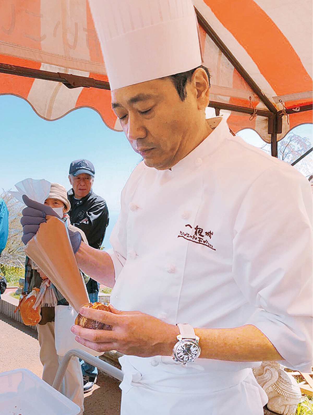 鎧塚俊彦オーナーシェフ=写真=が登場し、毎回行列となる今年の1日限定スイーツは「一夜城紅茶とシナモンのシュークリーム」(500個限定)。