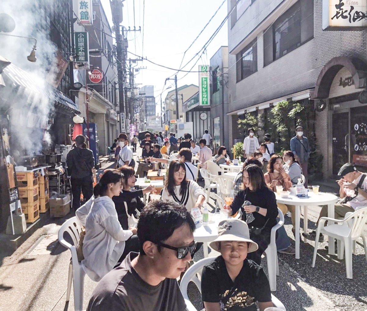 小田原駅前東通り商店街で10月23日、「秋はやっぱり!外呑み横丁」が開催された=写真。通行止めにした通りに約250の露天席が並び、テークアウトした食べ物や飲み物を手に、コミュニケーションを楽しむ人々でにぎわった。地元住民が集う場となり、イベントに参加したことで知人や友人と出会い、会話に花を咲かせる場面も見られた。