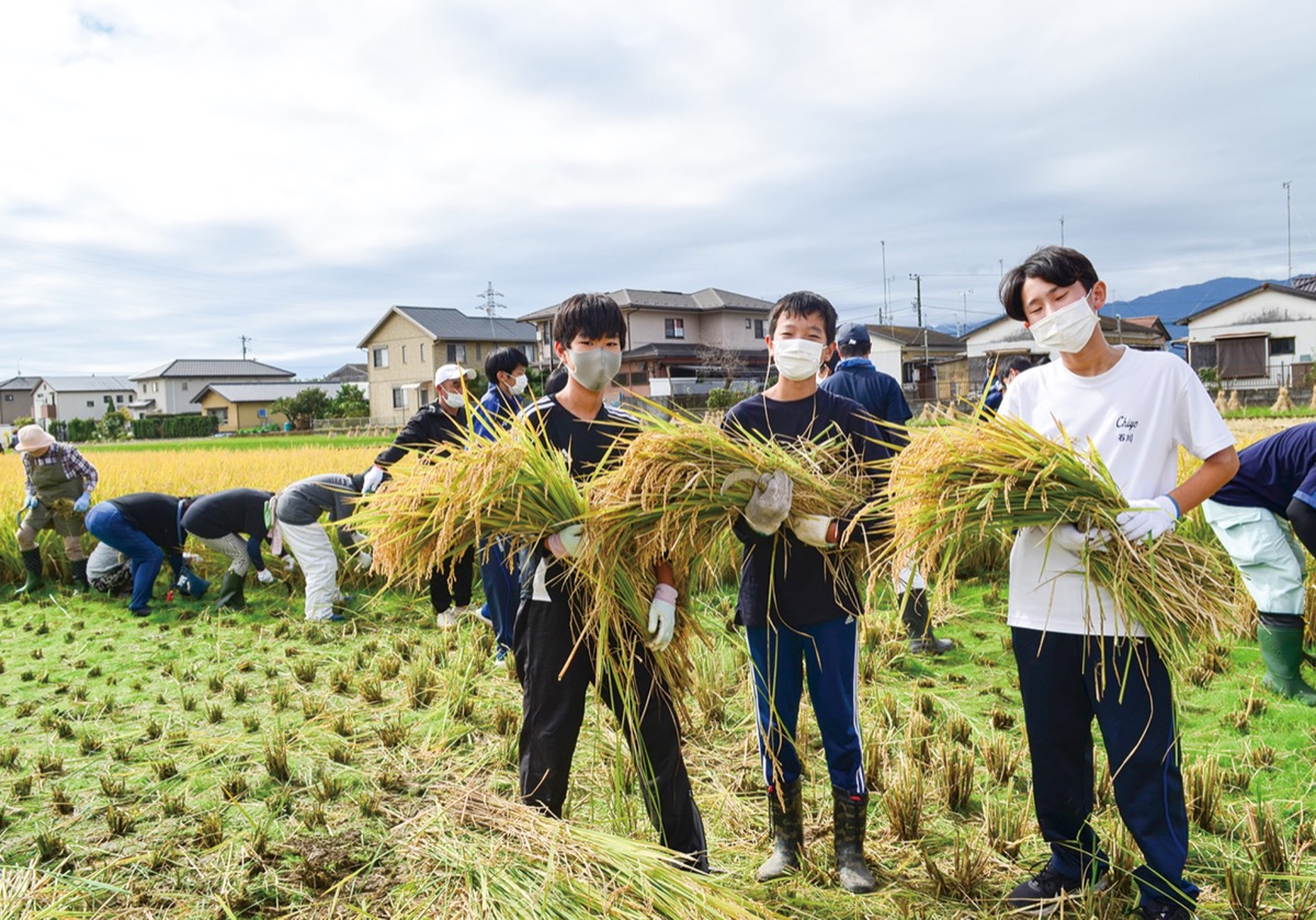 上府中地区まちづくり委員会は10月15日、小田原球場西側の田んぼに千代中学生22人を招いた。農業を通じて地域を理解してもらおうと2017年に始まった取り組み。収穫した米は精米後生徒に配布するほか、保護者に向けて販売し、売り上げを来年度の苗代などに充てる。飯田翔真さん(1年)は「収穫を頑張り、米の大切さを知ることができた」と話した。