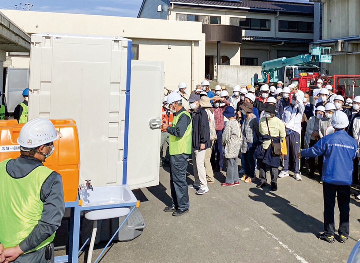 同組合は県西地域を中心に一般廃棄物処理事業者で組織された団体。この日、市内からは小田原衛生公社、(株)小田原衛生美化サービス、フロンティア1(株)が参加。仮設トイレの設置や避難所の感染症対策で注目されている手洗い設備「可動式手洗い架台」の試運用などが行われた。