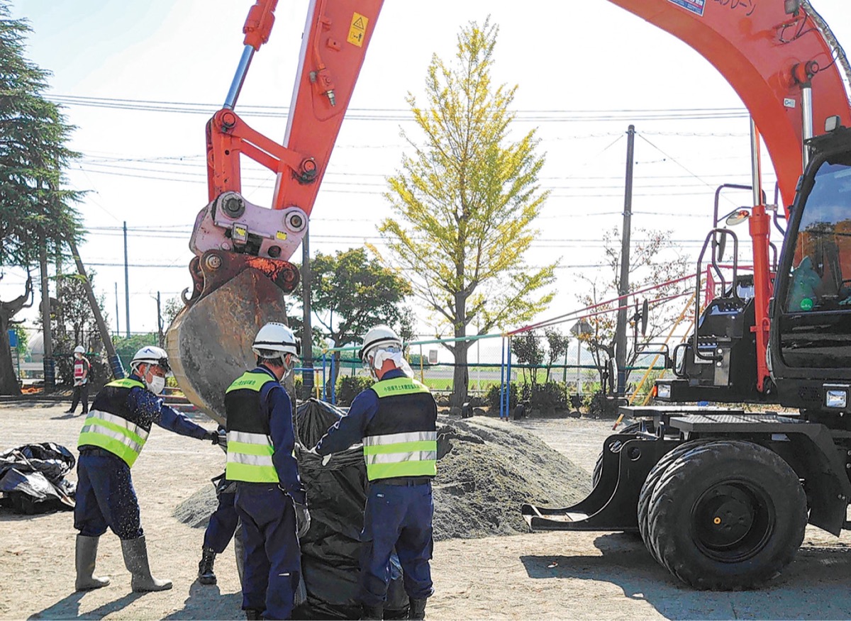 千代小学校では、上府中地区自治会連合会が中心となり水消火器の放水訓練、応急救護訓練などを行った。今回初めて小田原市土木建設協同組合も参加。土砂崩れで道路が寸断された想定で、大型重機を使い通行を復旧させ、また大型土のうを作り崩落を防ぐ措置をした。同組合担当者は「住民の方に復旧作業を見てもらう機会にもなり良かった」と振り返った。