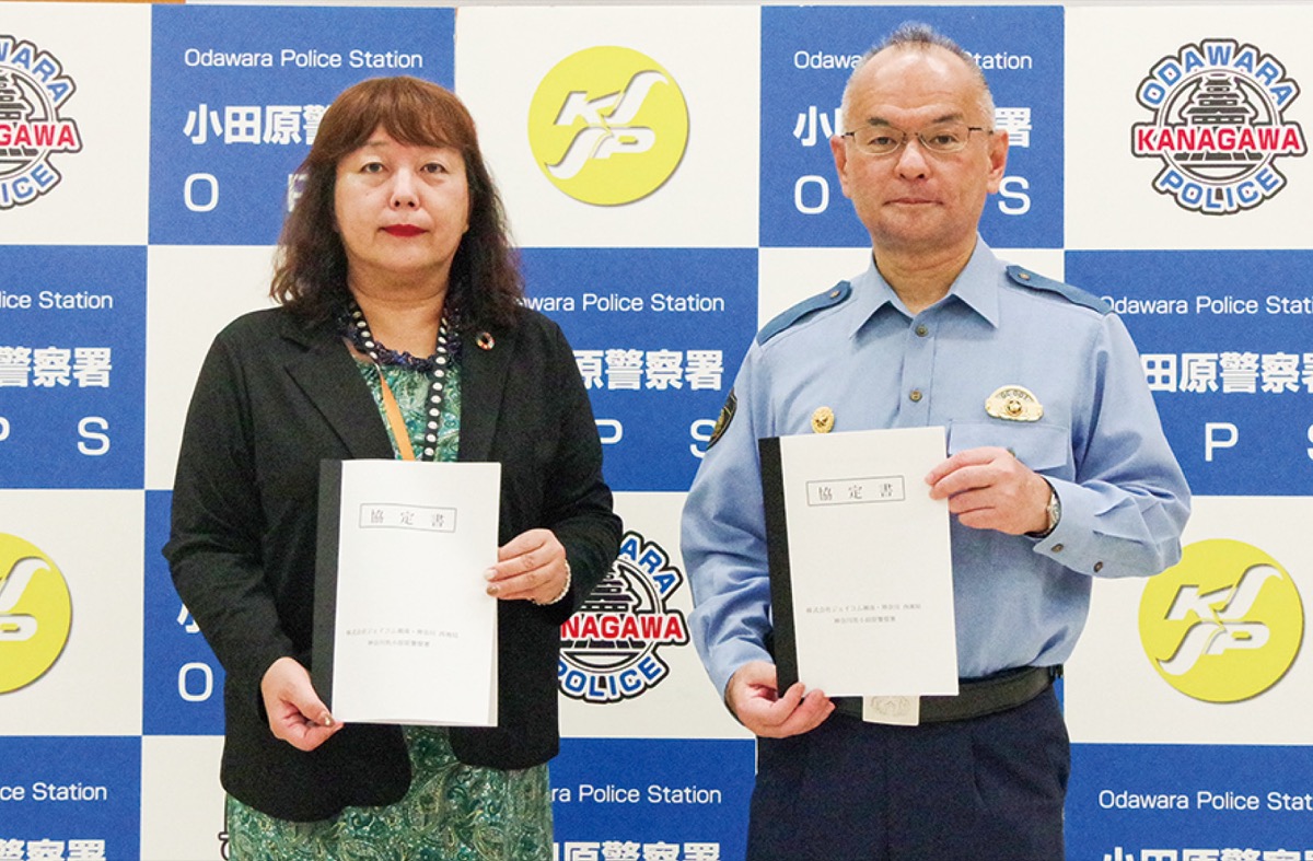 安全な地域づくりを協働で進めようと10月11日、小田原警察署(野崎剛志署長)と(株)ジェイコム湘南・神奈川 西湘局(矢端雅子局長)が地域安全協定の締結式を行った。同局ではこれまで秦野と伊勢原、松田の警察署と同様の協定を結んでおり、今回でエリア内の全警察署との安全協定が締結された。