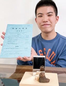小田原市在住の鈴木陽麿さん(平塚中等教育学校2年)が市内の久野一本松遺跡で全国的にも珍しい土器片「両面顔面把手(りょうめんがんめんとって)」を採集し、『神奈川考古』に論文を発表した。土器は、小田原市郷土文化館で開催中の「最新出土品展2022」で展示されている。