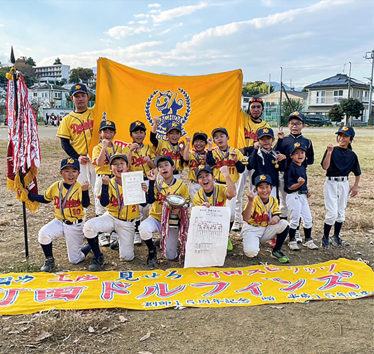 少年ソフトボール西湘大会2部(5年生以下)が10月22日と30日に開催され、町田ドルフィンズが優勝した。春の大会で負けていた小田原ハリケーンと準決勝で当たり、投手の柳田一聖さん(5年)が完封してリベンジを果たした。丸山秀和監督は「打線をつなぎ、皆でつかみ取った優勝」と喜びを語った。
