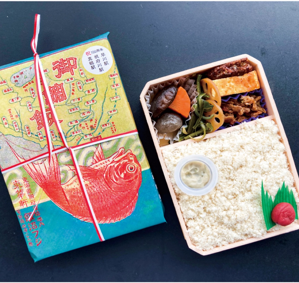 真鶴駅は1922(大正11)年12月21日に熱海線(現東海道本線)真鶴駅として開業した。記念イベントでは、期間中にみどりの窓口で入場券を購入した人を対象に大正時代の写真や真鶴の鉄道の歴史を載せたJR社員手作りの台紙をプレゼント。記念弁当として「御鯛飯」を真鶴駅ほか小田原駅、湯河原駅などで販売する(1080円)=写真。真鶴町の家庭で長く愛されているアジ、カマス、イワシのさつま揚げ、茎わかめとレンコンのきんぴらが入った弁当で、掛け紙は開業当時の復刻版となっている。