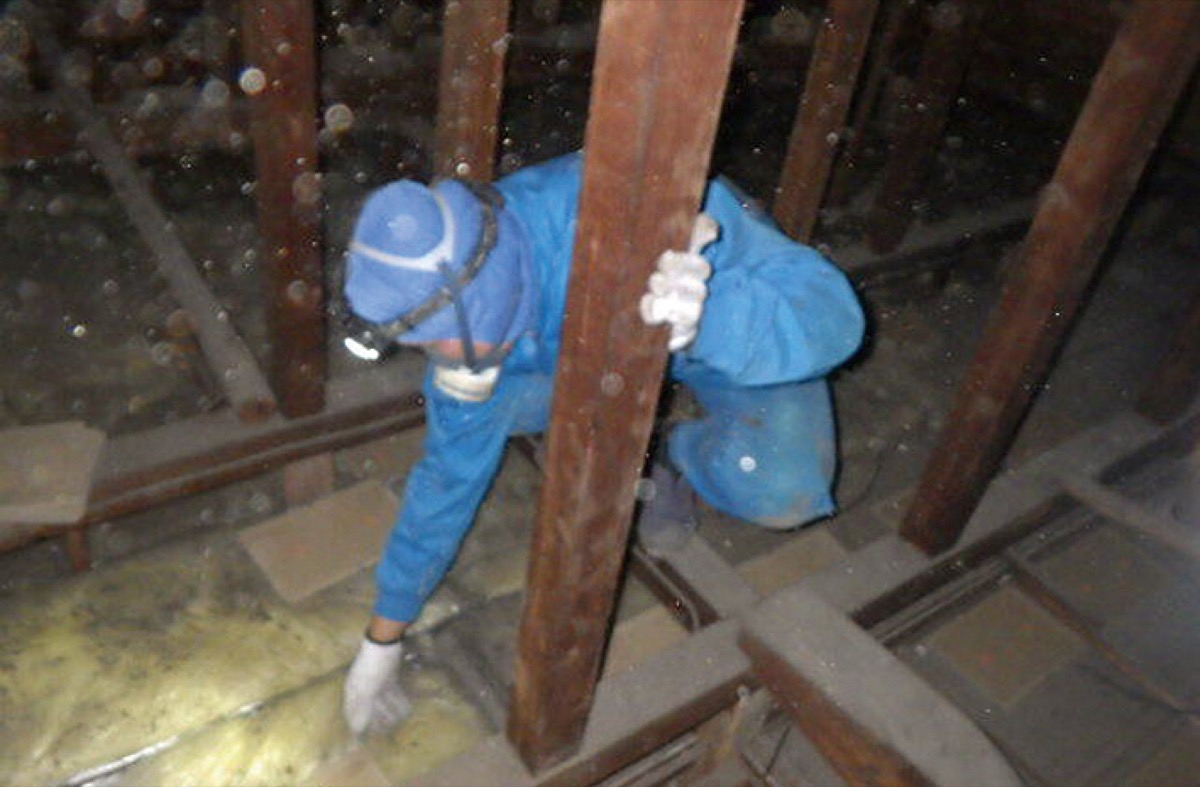 主に天井裏の糞清掃や消毒等、地味な仕事だが、人体に影響を及ぼす媒介生物なので保健衛生上重要だという。