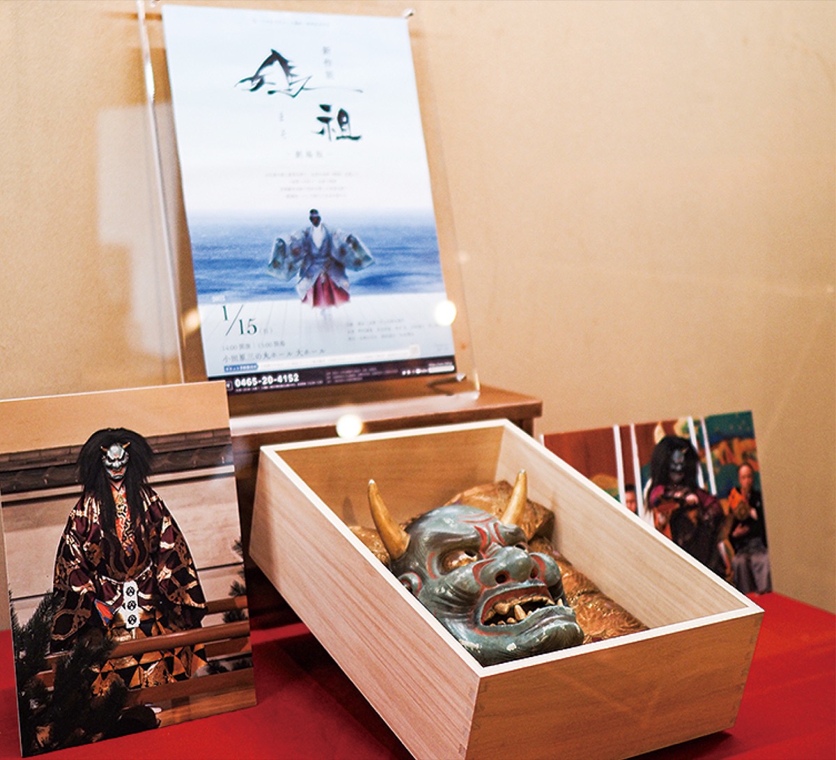 新作能『媽祖』は、江之浦の海から着想を得た、航海の女神「媽祖」を題材とする作品。能楽師・片山九郎右衛門氏がクラウドファンディングを行い、今年4月に京都で初演した。「千里眼」は先を見通す意味を持ち、媽祖が従える登場人物で、初演に合わせて制作された面だ。