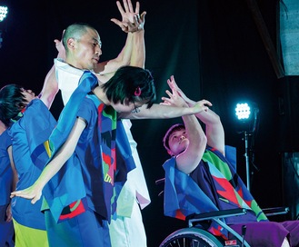今回の公演は、障害の有無に関わらず全ての人がダンスで交わり、結びつく場を創ることがコンセプト。認定NPO法人アール・ド・ヴィーヴル(小田原市久野)の利用者が「変身」をテーマに山海塾の踊手・松岡大さんらと踊った。