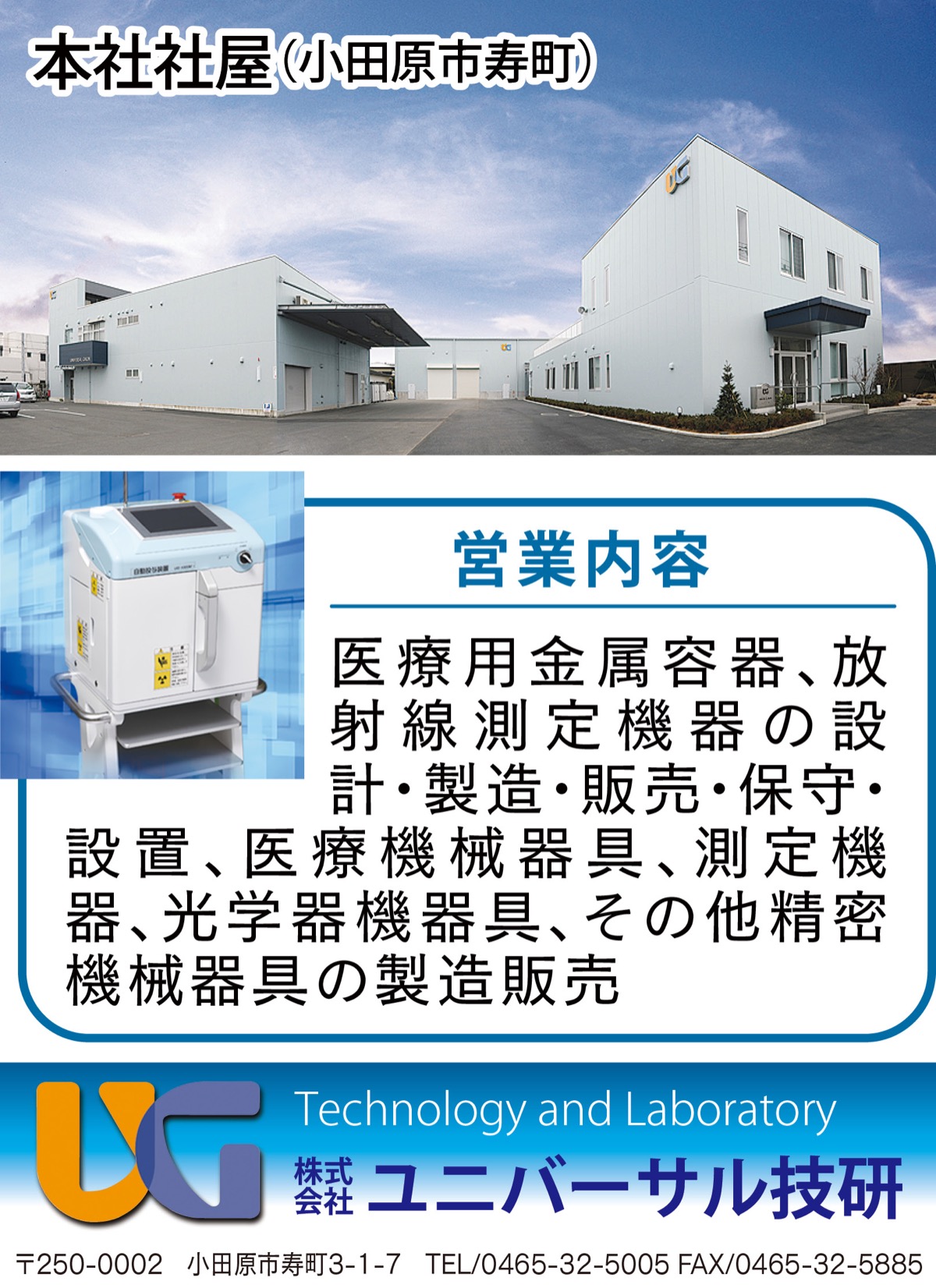 小田原市寿町に本社を構える(株)ユニバーサル技研は1988年創業。同分野において、放射性医薬品用を取り扱う上での被ばく防止のための自動化設備や遮蔽容器設計製作を手掛けている。