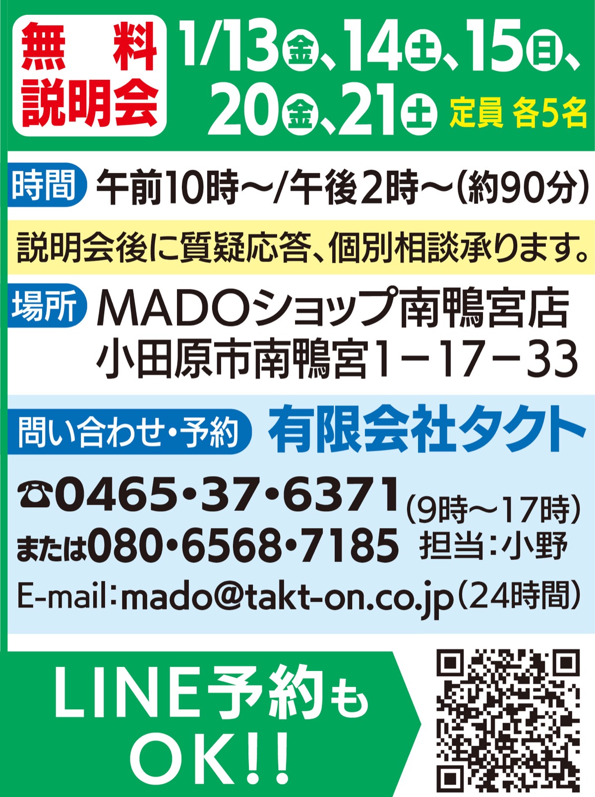 (有)タクト(小田原市)のおすすめは補助額が一番大きい「内窓設置」「外窓交換」。同社では、制度や対象製品などを分かりやすく解説する「無料説明会」を開催。「このチャンスを皆さまにGETしていただきたい」と呼び掛けている。
