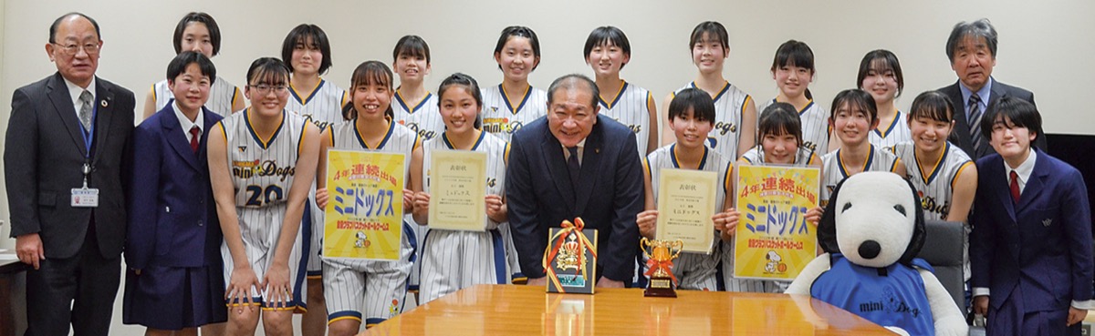 小田原市の中学生を主なメンバーとして活動する、女子バスケットボールチーム「ミニドックス」が、1月4日から6日に愛知県で開催された全国大会に出場し、ベスト16の結果を残した。18日に守屋輝彦小田原市長を表敬訪問し=写真=、杉田泰弘監督は「チームとして過去一番の成績を収めることができた」と喜びを語った。