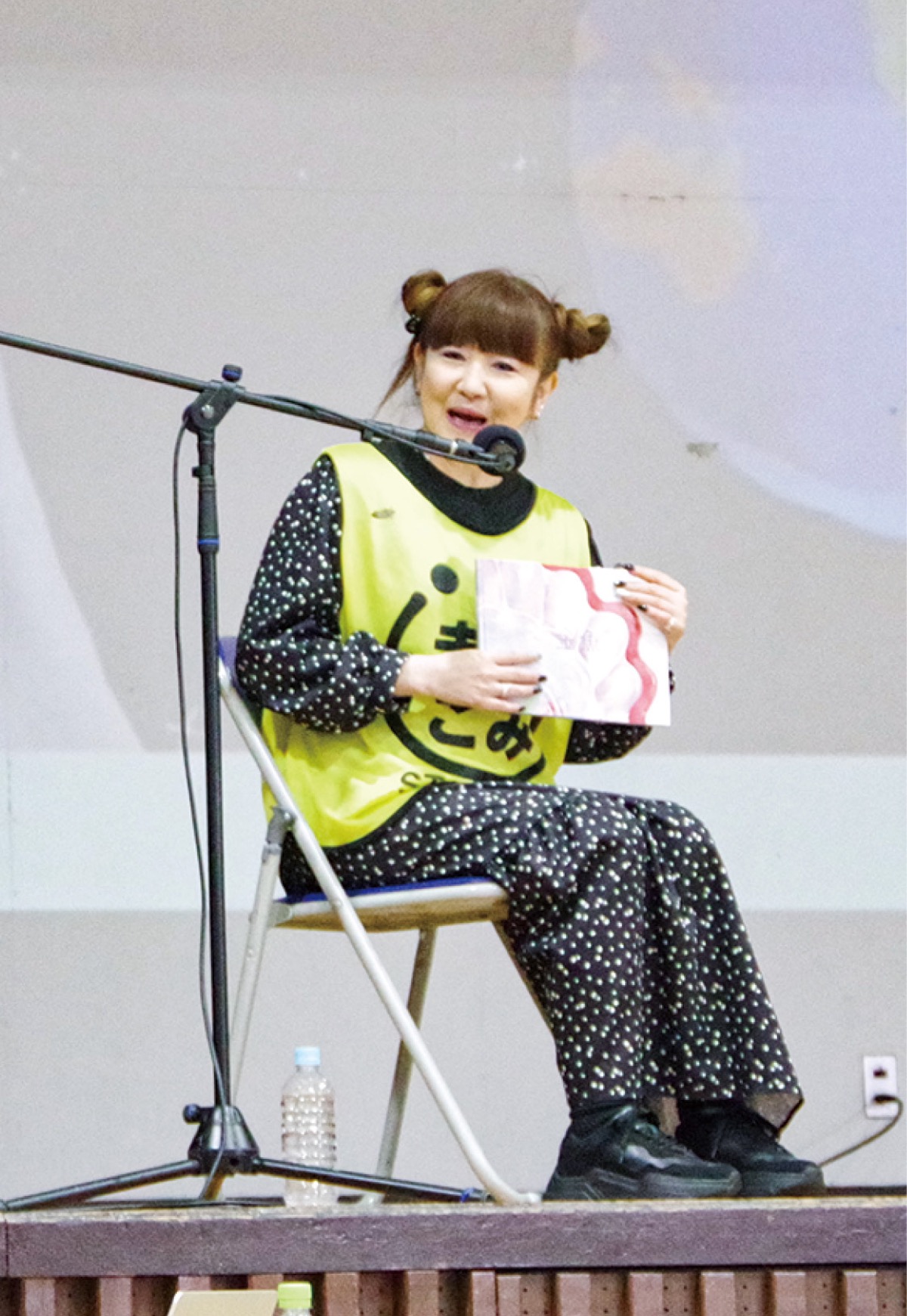 かないさんは雑紙から作られた絵本『金魚』を朗読。環境破壊が進む地球の姿を目の当たりにする宇宙人の物語を多彩な声で読み上げた。その後は県内の海岸清掃で集まるごみを回収している柱本さんが、光邦さんと海のごみを解説。海岸に多く集まるゴルフボールや微細なプラごみ「マイクロプラスチック」などを紹介しながら汚染の現実や環境保護の大切さを伝えた。
