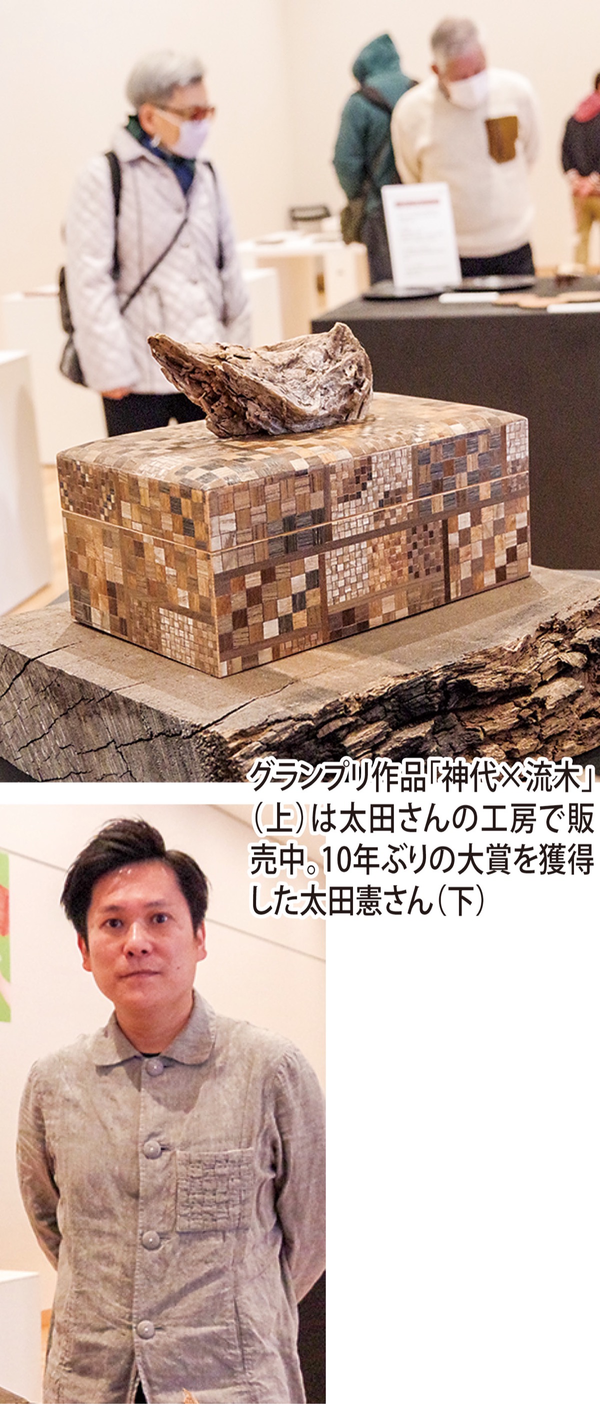 ホール展示室では職人が技術や感覚を競った公募展「木工―1 GP(グランプリ)」の作品を展示。グランプリを獲得した太田憲さんの「神代×流木」を中心に、サイズやジャンルを問わない優秀作品が並んでいた。