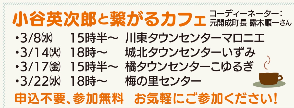 市政報告会(ゲストは小川淳也さん)と「小谷英次郎と繋がるカフェ」の開催!
