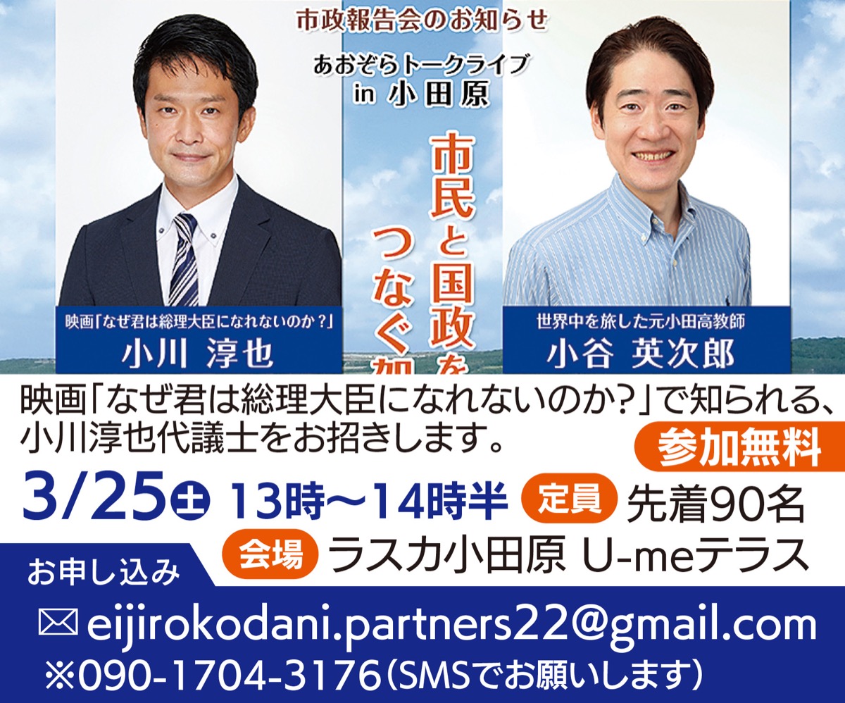3月25日は小川淳也さんを招き市政報告会を開催します。こちらは要予約です。席数限定につき、お早めにお申し込みください。