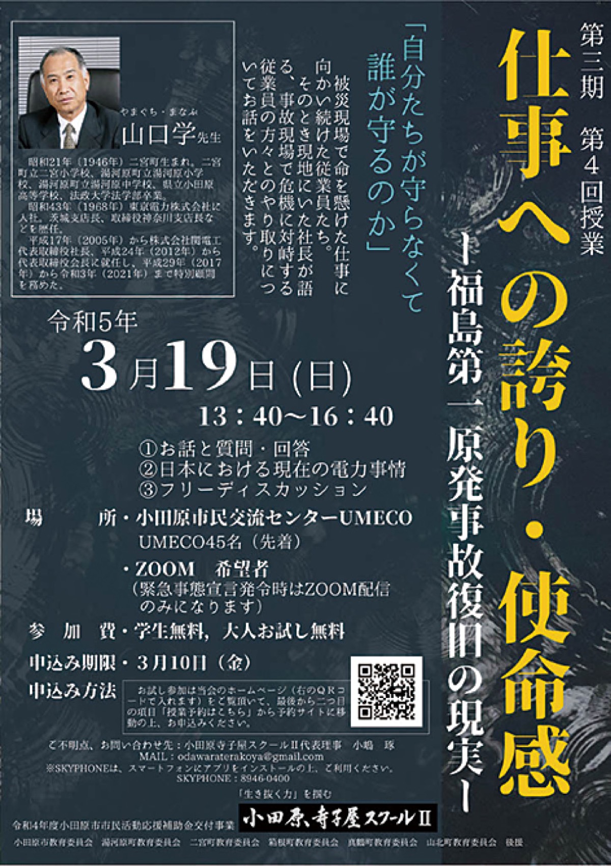 小田原寺子屋スクールII(小嶋琢代表理事=人物風土記に掲載)が3月19日(日)、交流センターUMECOで第4回授業「仕事への誇り・使命感―福島第一原発事故復旧の現実―」を行う。