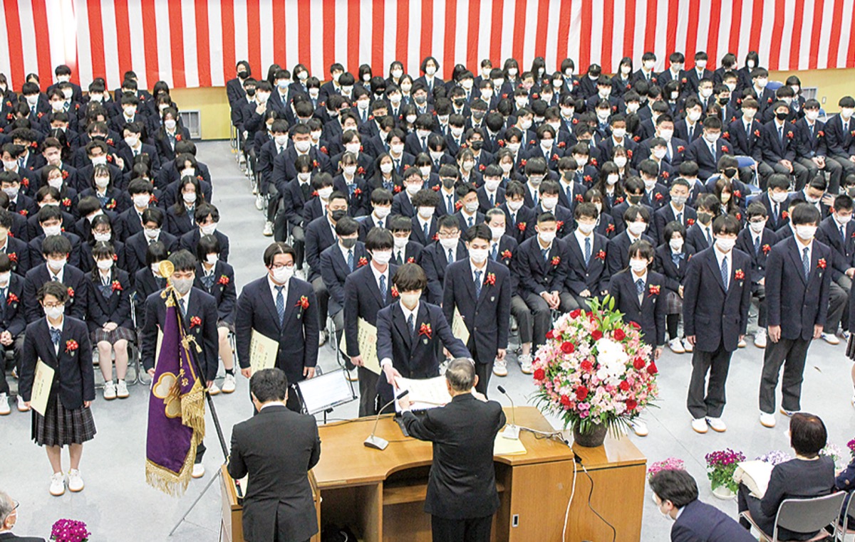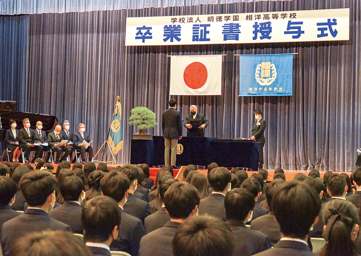 明徳学園相洋高校では、437人が新たな巣立ちを迎えた。杉崎朗校長は「コロナ下で迷いながらも全力で駆け抜けた高校生活だったと思う。できない中で、できる方法を考えるようであってほしい」と話した。また、同学園出身で元衆議院議長の河野洋平氏が来賓として訪れ、激励の言葉を贈った。