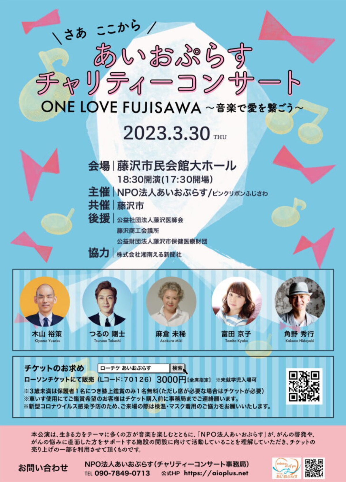 「ピンクリボンふじさわ」として乳がん検診の啓発事業を推進してきたメンバーを中心に、乳がんをはじめとするがんによる死亡者をゼロにすることを目的に活動する「NPO法人あいおぷらす」。3月30日(木)、同NPOが主催するチャリティーコンサート「さぁ!ここから 〜音楽で愛を繋ごう〜 ONE LOVE FUJISAWA」が開催される。