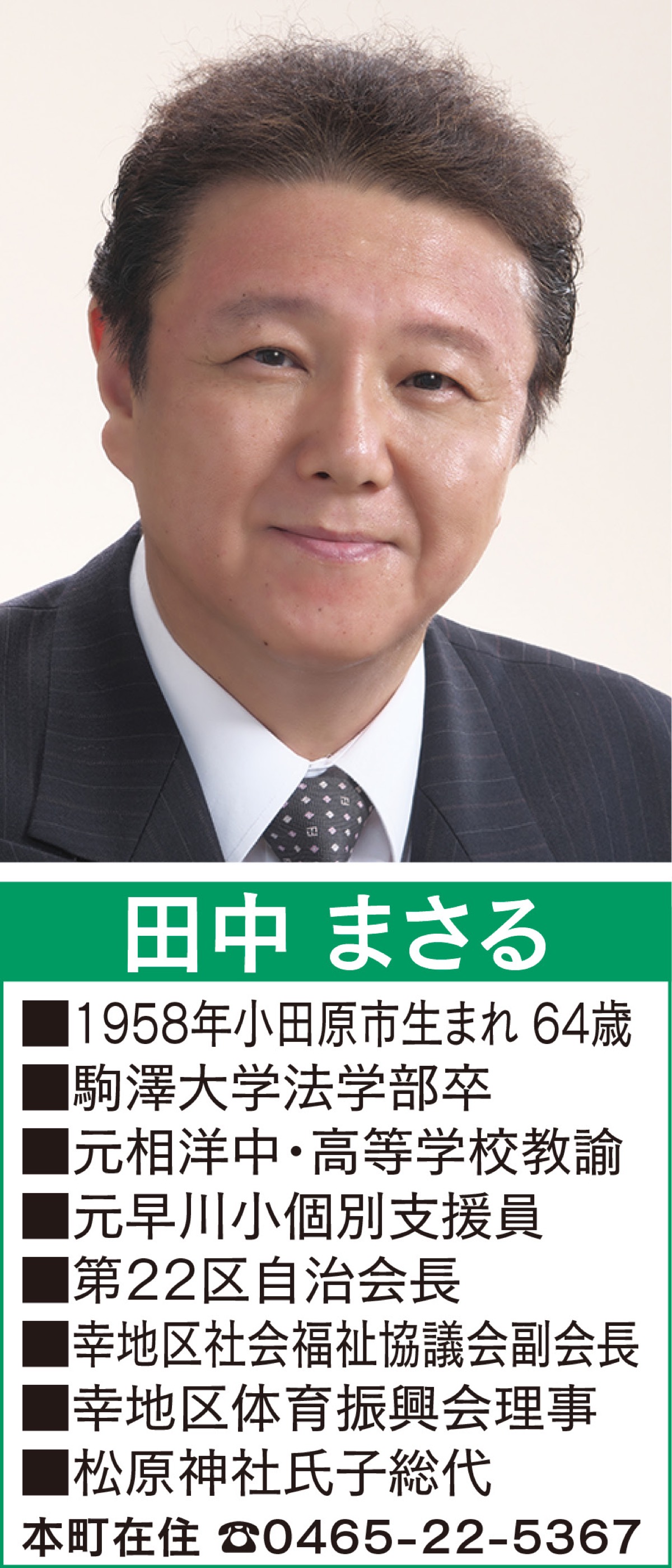 このような中で多くの皆様方より、地域だけでなく小田原全体のためにも尽力してほしいとのお声をいただいています。「教育環境の更なる充実および子育て支援や福祉政策の拡充」「治安・防災にもつながる人にやさしい地域コミュニティの再興」などを目指して、人にやさしいまちづくりに改めて力を尽くして参りたいと思います。