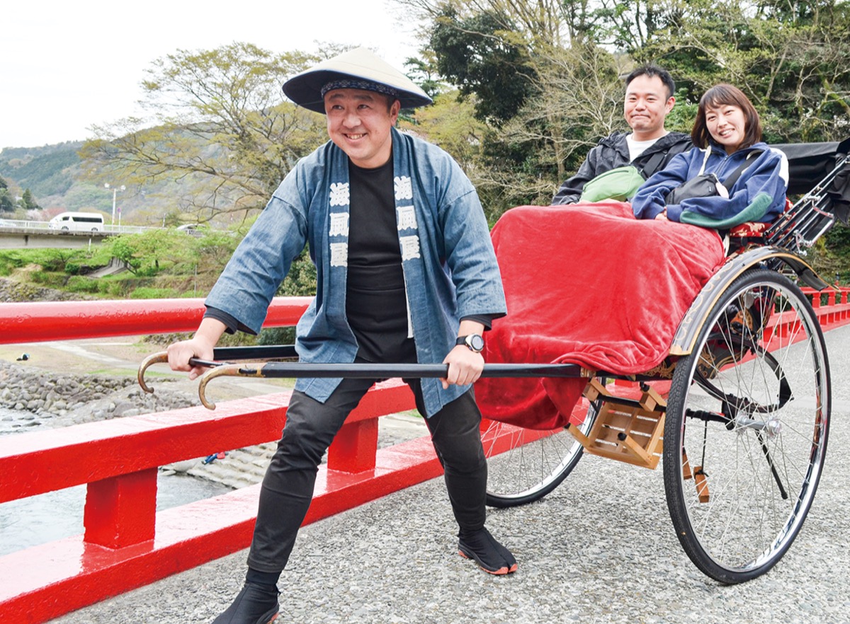 「車で通らない裏通りの観光案内が得意です」と話すのは、箱根湯本の「あじさい橋」発着で人力車を引いている「人力車 海風屋(うみかぜや)」の小川勝規代表=人物風土記で紹介=。重さ約90kg、人が2人乗ると計200kgを超える人力車を引いて、観光名所を案内している=写真。車体が平行になるバランス感覚を掴めると弱い力で引くことができるという。「上下に揺れるとお客さんも酔うので、バランス感覚がとても重要」と話す。