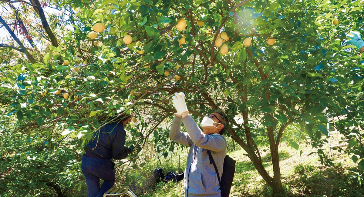 小田原産レモンを使ったチューハイ「寶CRAFT 小田原レモン」を手掛ける宝酒造(京都市)の社員が4月10日、小田原柑橘倶楽部の管理する片浦エリアの農園を訪れ、レモンの収穫を行った。