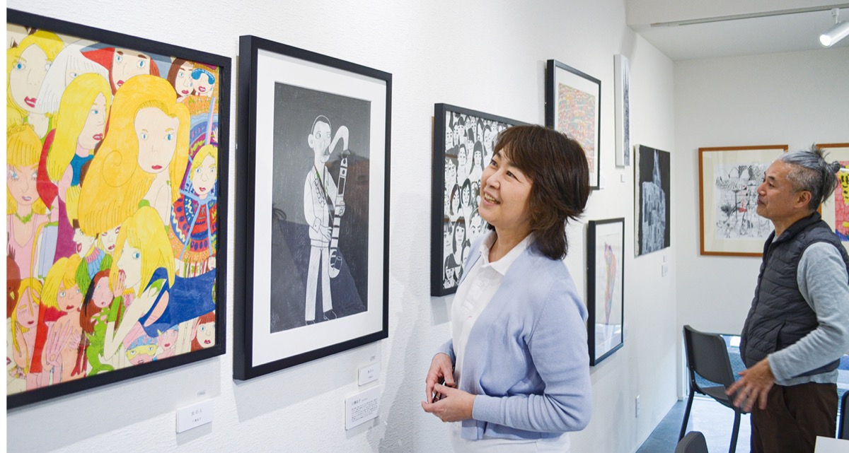 第1会場は、社会福祉法人アール・ド・ヴィーヴル(萩原美由紀理事長)のギャラリーカフェ。障害者アートの枠組みで50年以上前から社会に変化を与える活動を行ってきた奈良県の「たんぽぽの家」のほか、滋賀県の「やまなみ工房」、福岡県の「工房まる」、埼玉県の「工房集」の4施設から23作品を展示中。キュレーションを担当した中津川浩章さんは「障害者アートの草分け的存在が一堂に会する。脚光を浴びる前から苦労を共にしてきた仲間なので、作品に触れながらぜひ背景も知ってもらえたら」と話している。5月26日(金)まで(平日のみ)。午前10時30分〜午後4時。