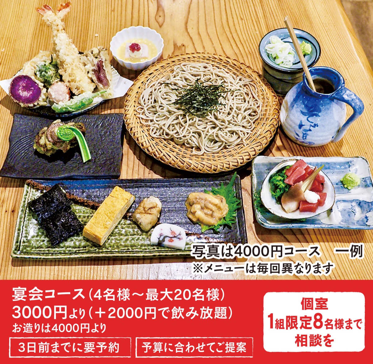 かまぼこや塩辛などを取り入れた前菜に始まり、焼き物、天ぷらなど地元食材をたっぷりと使用。さらに、新鮮な魚介類のお造りも好評だ。(※お造りは4000円以上のコースより)。もちろん、こだわりのそばも味わえる、お得なコースとなっている。蕎麦焼酎、地酒も豊富。