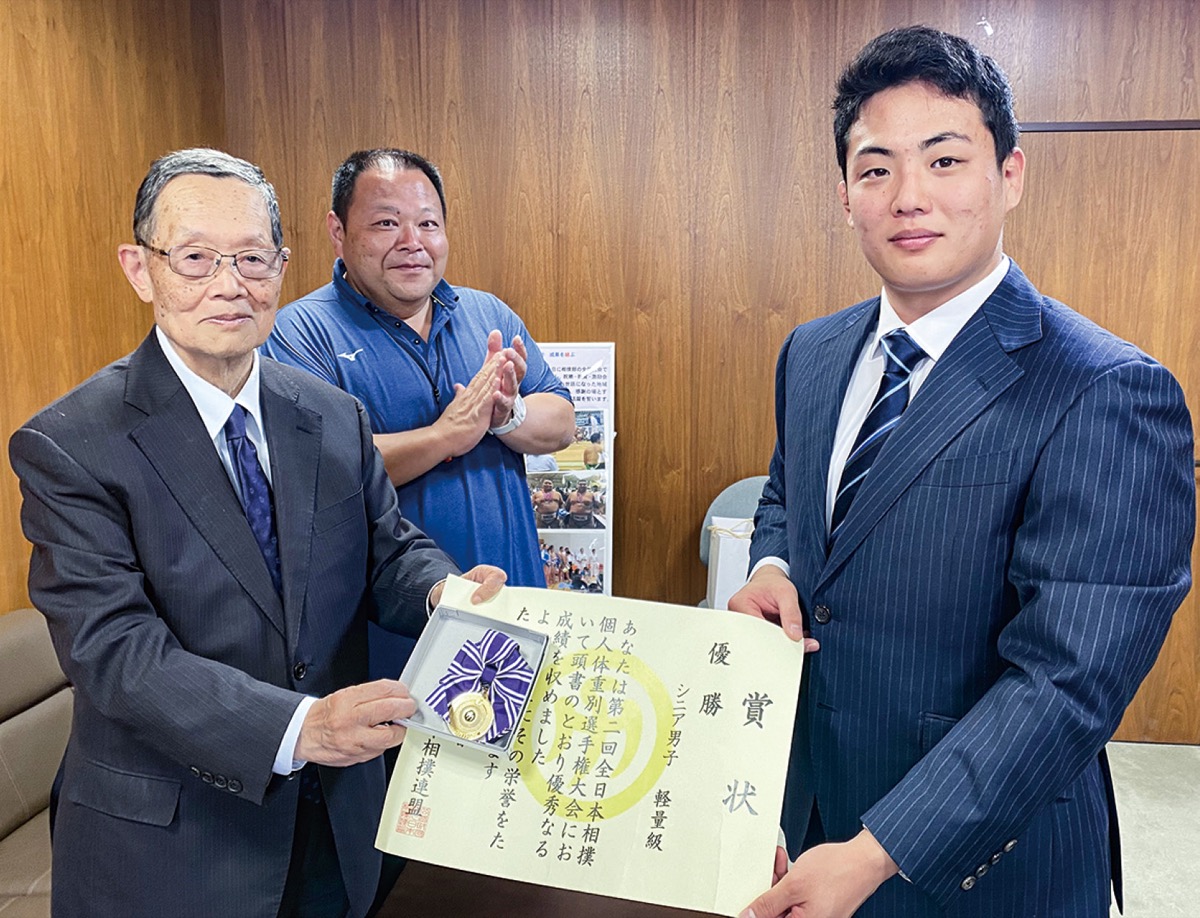 5月に靖国神社相撲場で行われた「第2回全日本相撲個人体重別選手権大会」の男子軽量級で優勝し、10月に開催される世界相撲選手権大会の日本代表に選ばれた奥知久さん(日体大3年)が5月26日、母校の旭丘高校を表敬訪問した。