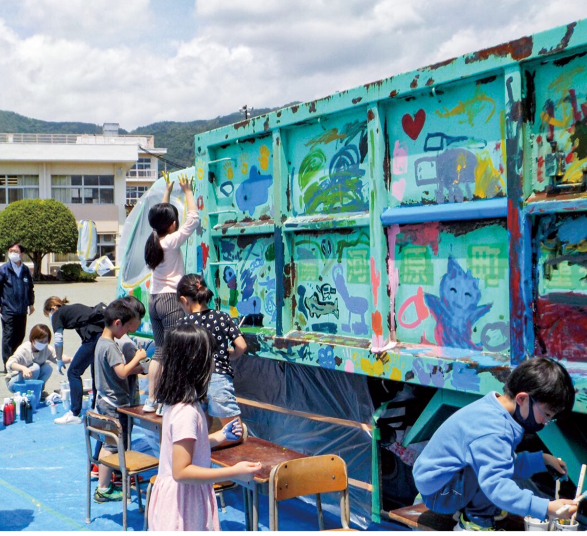 アフリカンペイントアーティストSHOGENさんの指導のもと、児童と保護者ボランティア、教員らがパッカー車やトラックにアートを施した。「自分のために描くんだよ」というSHOGENさんのアドバイス通り、6色のペンキを混ぜ合わせながら楽しんで描いていた。津田清校長は「みんなが楽しく、し・あ・わ・せな時間が過ごせたと実感できた」と話していた。
