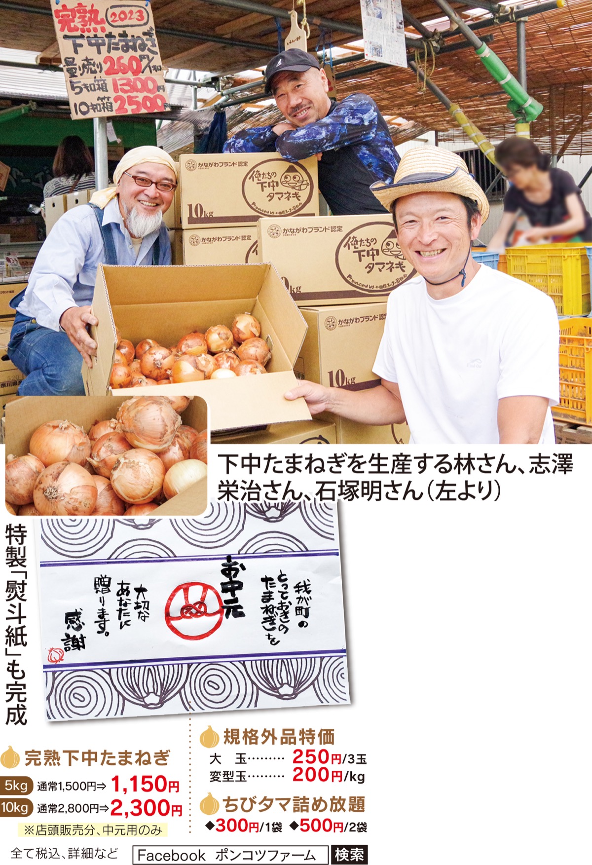小田原市と二宮町の境にある農産物直売所ポンコツファームが、収穫の最盛期を迎えた「下中たまねぎ」を夏ギフトで贈ろうという市内外からの人で賑わっている。