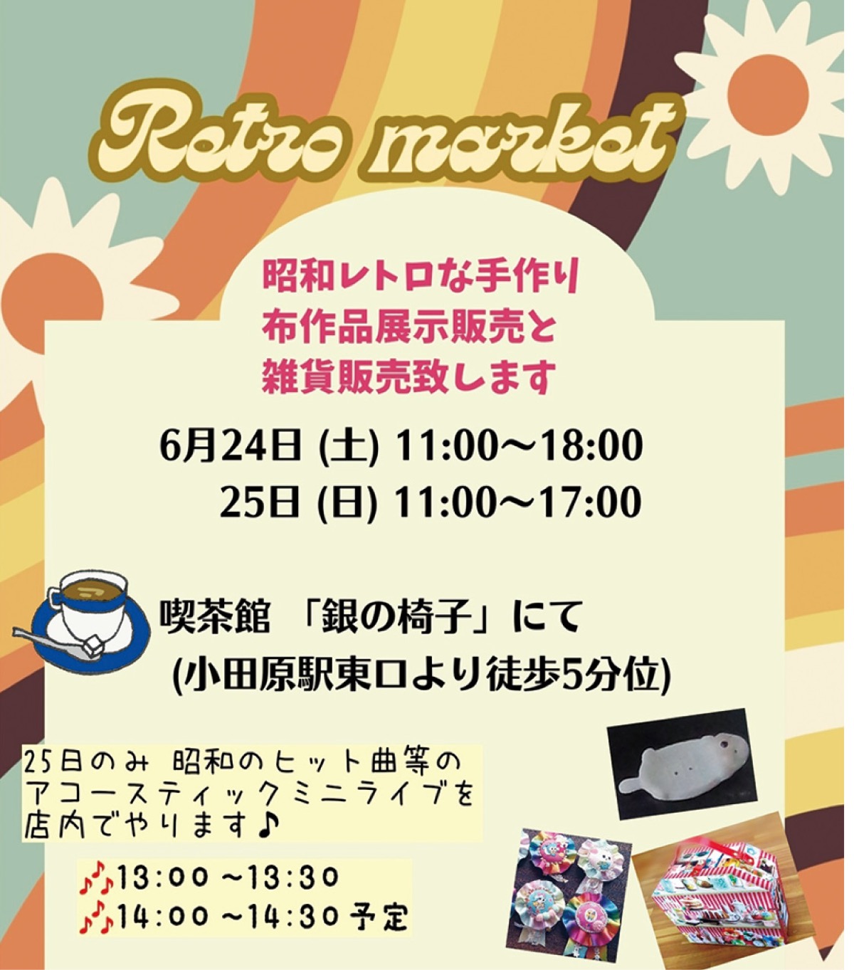 松井さんと「布小物クスリヤ」による、昭和レトロをイメージさせるかわいい雑貨や小物の展示販売や、フリーマーケットが行われる。また、25日にはアコースティックライブも予定されており、なつかしの昭和ヒット曲等を演奏する。時間は午後1時と2時からそれぞれ30分間絵演奏する。松井さんは「マーケットもライブもご覧になるだけで大歓迎です」と話した。