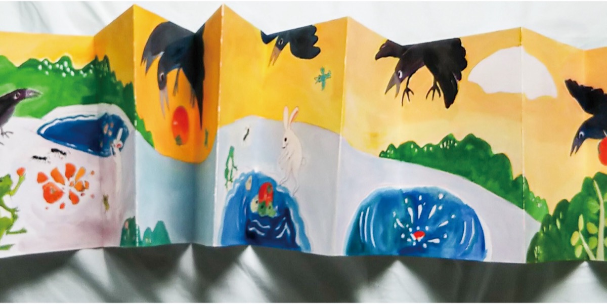 同作品は字が書かれていないジャバラ絵本で、1つだけ木に残した柿を鳥や動物たちに与え、自然の恵みを分かち合おうという木守柿の風習を描いている。原口さんは「絵本を読んで多くの人たちに優しい心が広がっていったら」と話した。著書は全国の書店やオンラインで販売している。