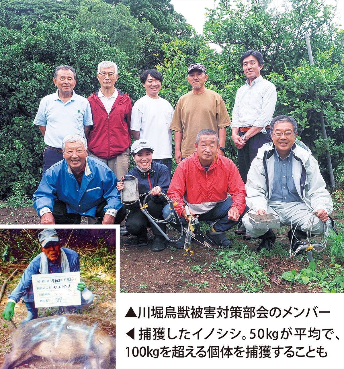 地区内の農家が中心となり7人が集まり、19年の7月にイノシシを捕獲するための狩猟免許(わな猟)を全員で取得した。10月に「川堀鳥獣被害対策部会」を立ち上げた。