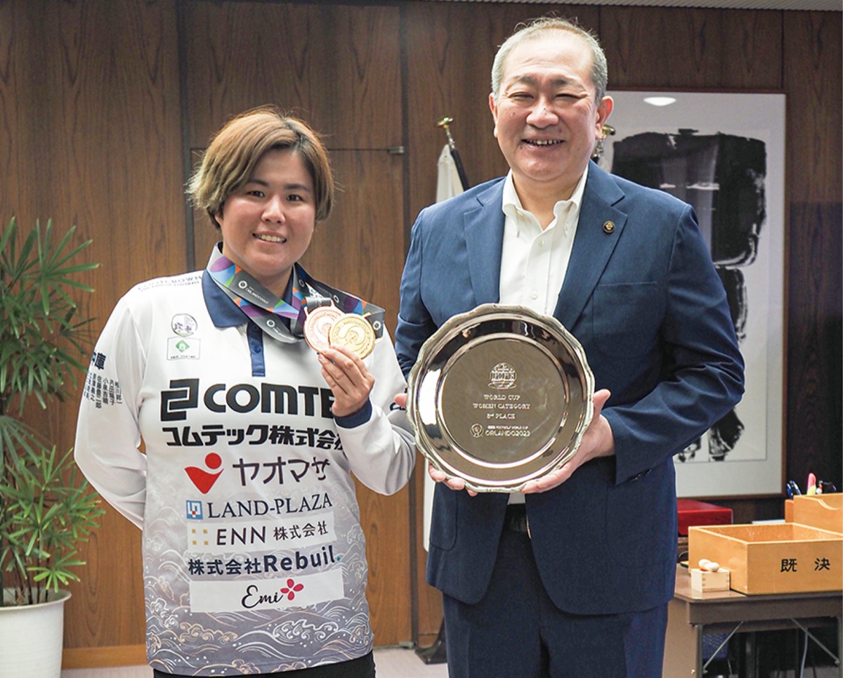 守屋市長は「世界一になれることはなかなかない素晴らしいこと。子どもたちや地域のスポーツ振興にもその経験を貢献してもらえれば」とその活躍を称えた。三浦さんは「地域のサポートに感謝したい。小田原市や近隣のこどもたちにフットゴルフを伝えていきたい。次のワールドカップをぜひ日本で開催したい」と話した。