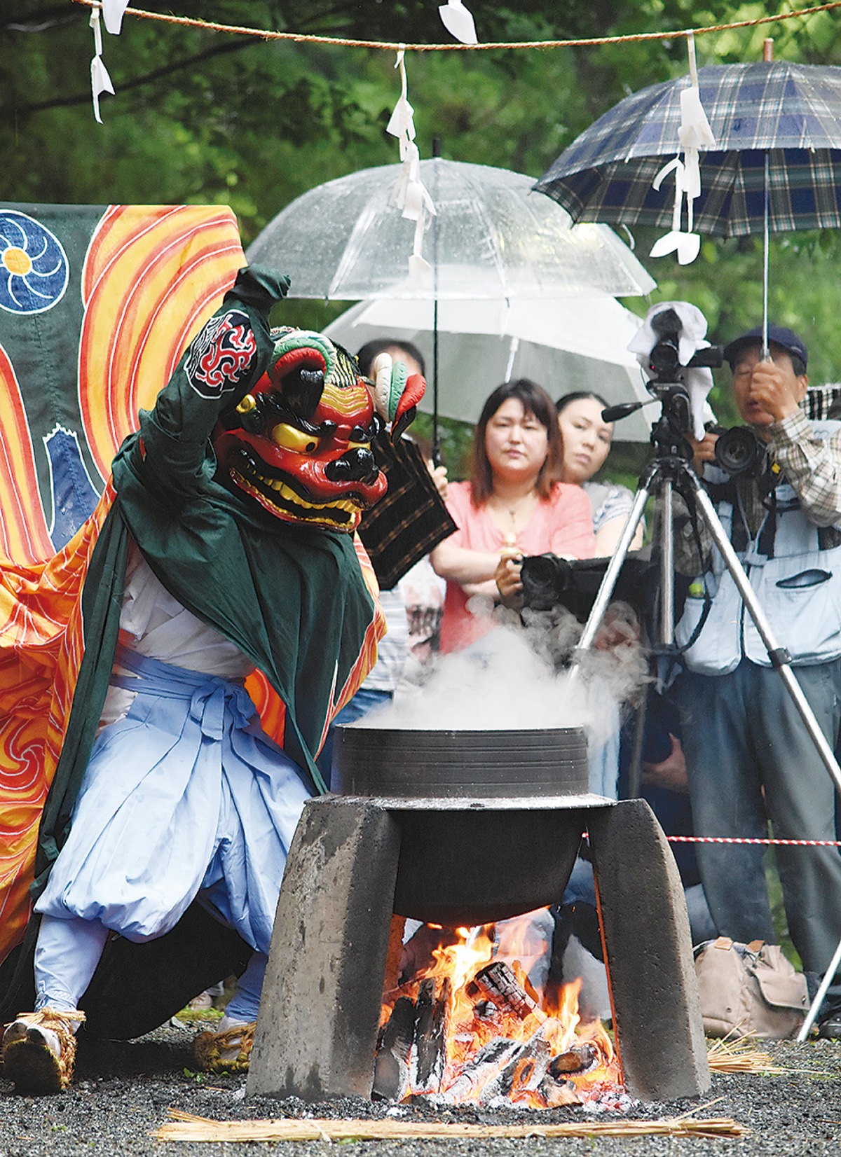 午後2時開始。獅子頭を被った人が幣束や笹で釜の湯をかき混ぜ、人々に振り掛けて祓い清める。この湯に掛かると、1年間病気にかからず健康で過ごせるといわれている。少雨決行。車で来る人は、近隣有料駐車場の利用を。バスの最寄りは箱根登山バスの「宮城野」停留所。