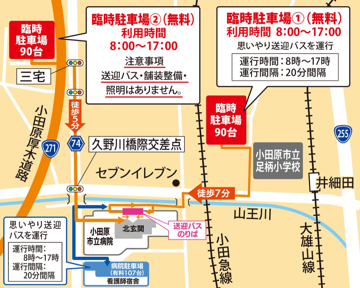 「思いやり送迎バス」は車椅子利用者やベビーカー・子連れなども利用が可能。病院関係者は「病院駐車場が混雑しがちなので、車でお越しの方、面会で来院される方は無料の臨時駐車場【1】、【2】の利用検討を」と周知を図っている。