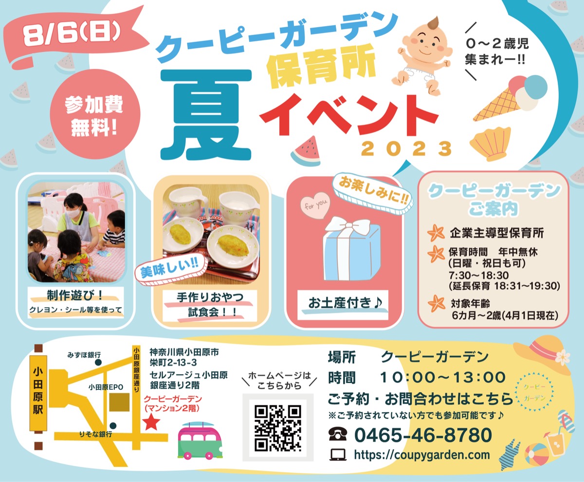 小田原駅東口から歩いて約5分。保育所「クーピーガーデン」が8月6日(日)、夏イベントを開催する。午前10時〜午後1時、参加無料。