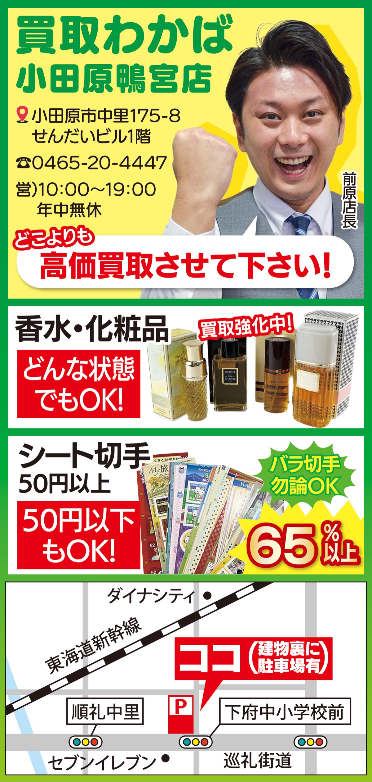 買取わかば小田原鴨宮店の前原店長は現在、香水・化粧品のコスメ商品の買取を強化している。「旅行先で買ったり、友人にもらったりして、そのまま眠っているものはございませんか」と前原店長。香水は古くなると変色して、匂いが変わることがあるが、前原店長はどんなに古くても、使いかけでも買い取ってくれるという。「そのお片付けちょっと待ってください。品数があれば買取金額もアップするので、ぜひまとめてお持ち込みください」。メッキアクセサリーや貴金属、ブランド品も買取強化中だ。