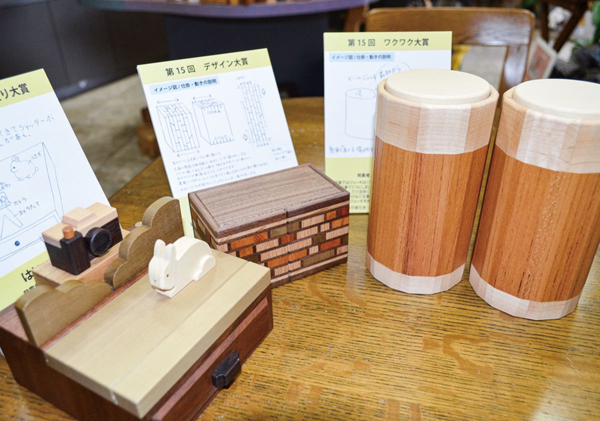 2会場では3作品を展示している。木のジョッキを乾杯することで底の蓋が開く「乾杯‼」と、木の模様をあみだくじに見立て、完成させることで箱が開く「あみだくじ」、うさぎをカメラの前に移動させシャッターを押すことで引き出しが開く「はい、ポーズ!」。会場では実際にからくり箱を手に取り、遊ぶことができる。