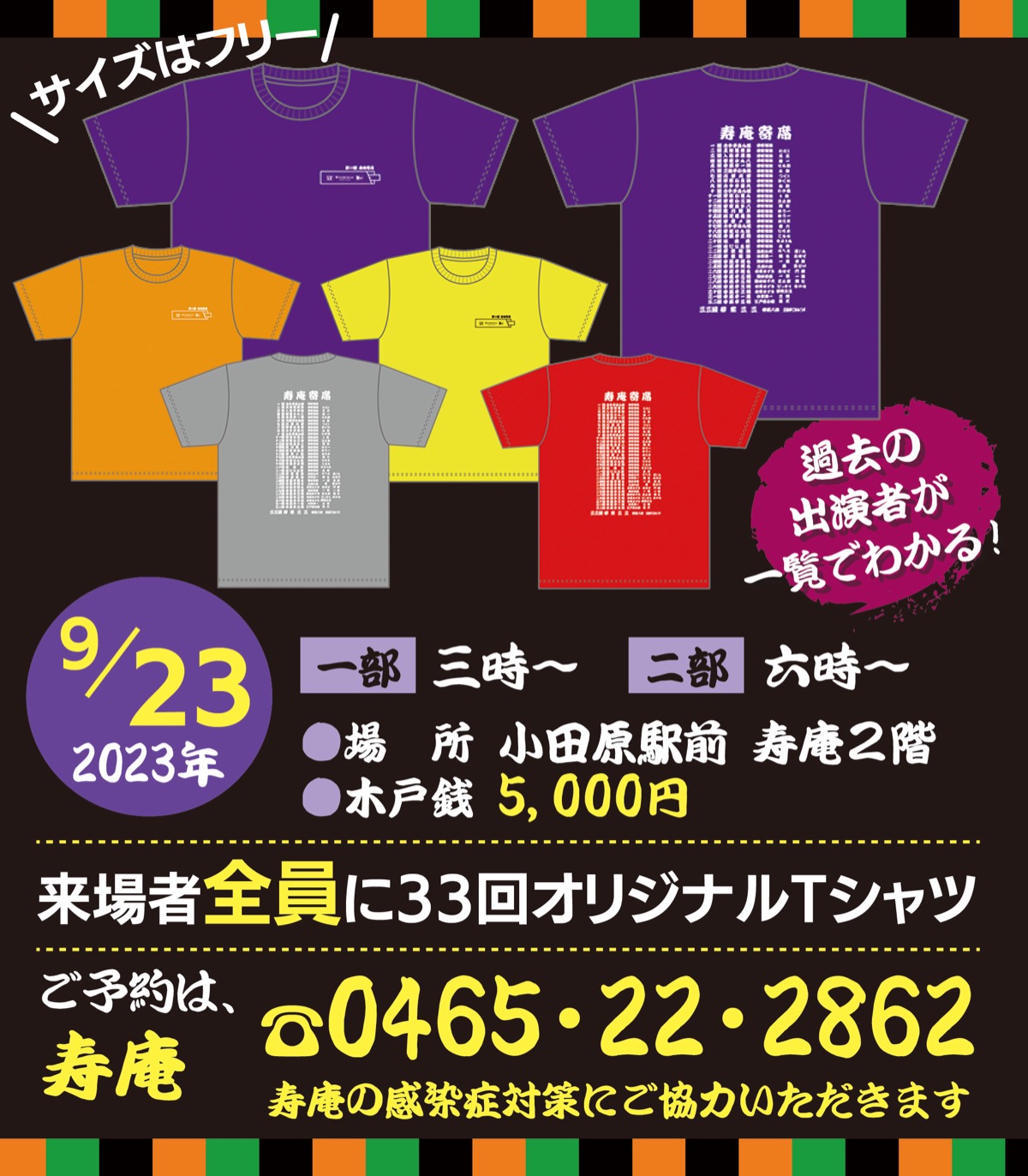 今回、33回を記念し、第1回からの演者を記したオリジナルTシャツを来場者全員にプレゼント(5色のいずれか)!さらに、当日に三三さんが高座で使用した33回記念座布団を来場者の中から抽選で1人にプレゼントする豪華企画だ。