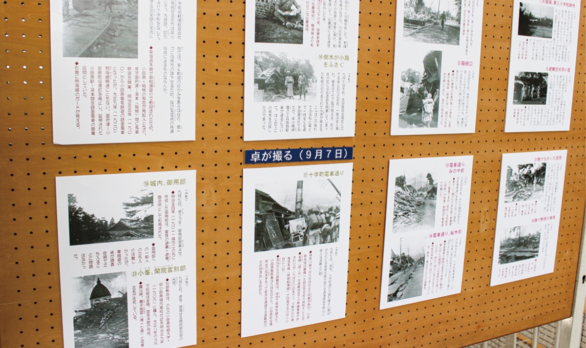 期間中は写真35点とそのメモの内容をまとめたパネル22枚を展示。震災翌日の自宅をはじめ、箱根口、御用邸などを紹介している。「大西海子角」の様子について「こゝでも沢山人が中へふせられてしまったし、此となりでは圧死者も重傷者もあった。」などと書き記されていた。