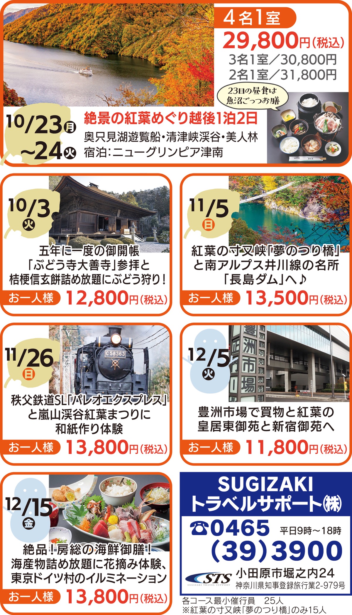 地元発着のバスツアーが好評の「スギザキトラベルサポート」に6コースが登場。1泊2日で楽しむ奥只見湖や豊洲市場での買物など添乗員同行の日帰りツアーを用意。各コースミナカ小田原バスターミナル、一部JR松田駅北口発着。詳しくは、旅行パンフレットで確認の上、申し込みを。