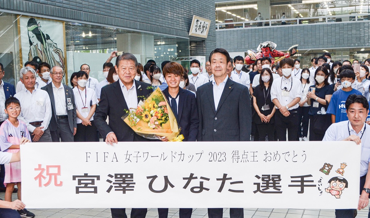 8月20日に閉幕したサッカー女子ワールドカップ2023で5ゴールをあげ、日本人として2011年大会の澤穂希選手以来2人目となるゴールデンブーツ賞(得点王)に輝いた宮澤ひなた選手が8月24日、出身地の南足柄市へ戻り、市役所で市民らの歓迎を受けた=写真。