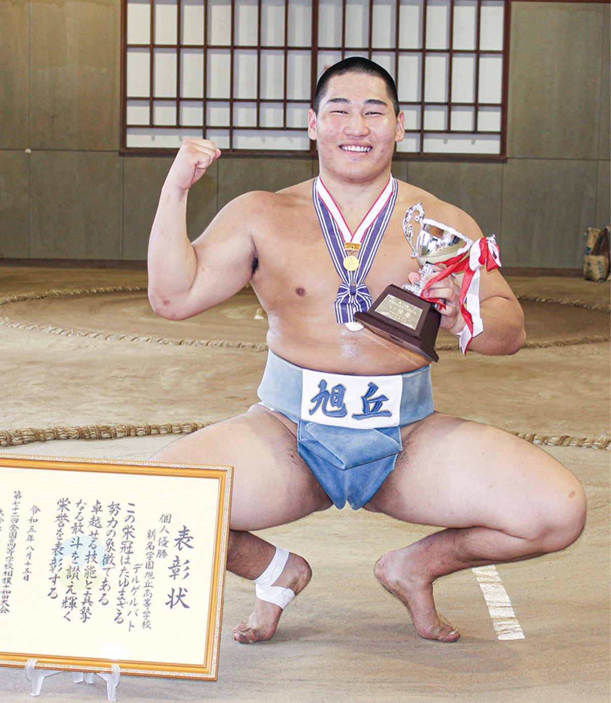 新名学園旭丘高校相撲部(岸田光弘顧問)のデルゲルバトさん(3年)が8月15日に青森県で開催された「第72回全国高校相撲十和田大会」の個人戦で優勝した。2011年の立ち上げ以来、初の全国制覇を成し遂げた。