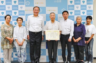 小田原市の十字地区第29区自治会が小田原市役所で8月29日、横浜国道事務所から永年の道路愛護活動の功績への感謝状が贈呈された。