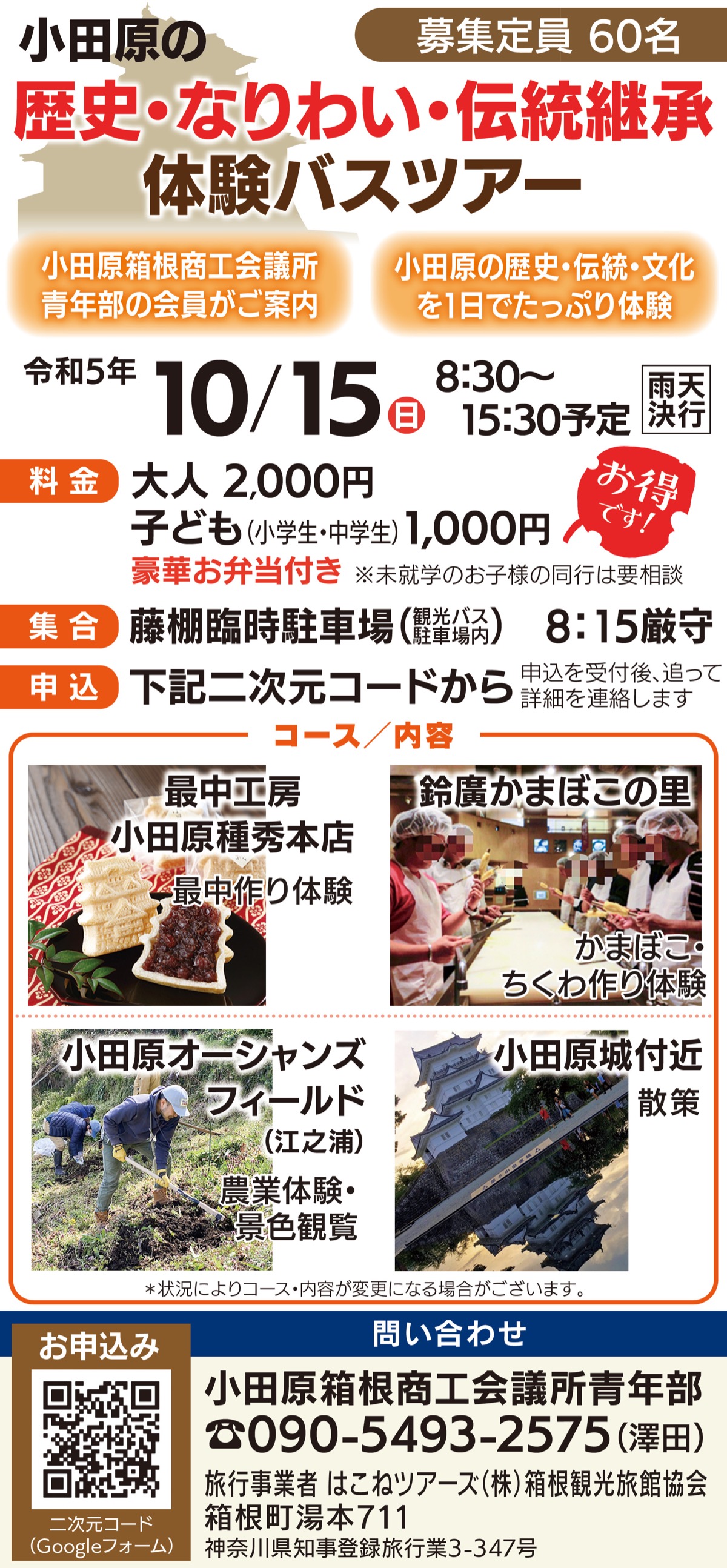地元の名店、名所そして意外と知らない穴場まで。小田原の歴史・伝統・文化を1日で体験できるバスツアーが10月15日(日)に開催される。